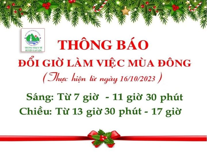 Trung tâm Y tế huyện Can Lộc trân trọng thông báo thời gian làm việc mùa đông kể từ ngày 16 tháng 10 năm 2023 đến ngày 15 tháng 4 năm 2024 như sau: