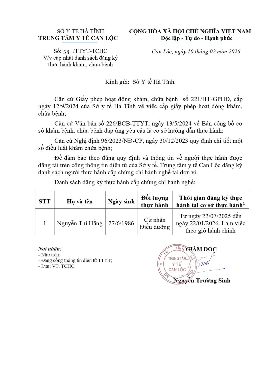 Để đảm bảo theo đúng quy định và thông tin về người thực hành được đăng tải trên cổng thông tin điện tử của Sở y tế. Trung tâm y tế Can Lộc đăng ký danh sách người thực hành cấp chứng chỉ hành nghề tại đơn vị