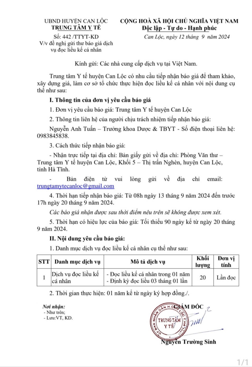Trung tâm Y tế huyện Can Lộc có nhu cầu tiếp nhận báo giá để tham khảo, xây dựng giá, làm cơ sở tổ chức thực hiện đọc liều kế cá nhân