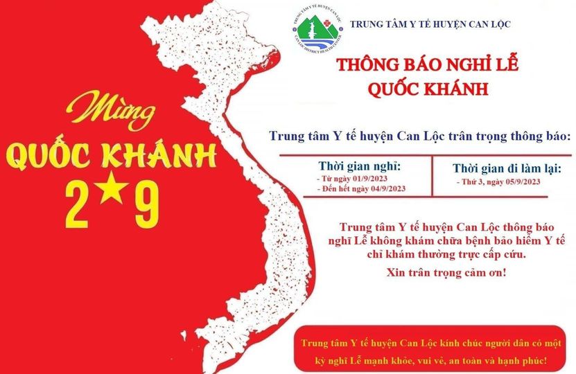 Thời gian nghỉ lễ: Trung tâm Y tế không Khám chữa bệnh BHYT vào ngày Thứ 7 (ngày 02/09/2023) và Chủ nhật (03/09/2023).