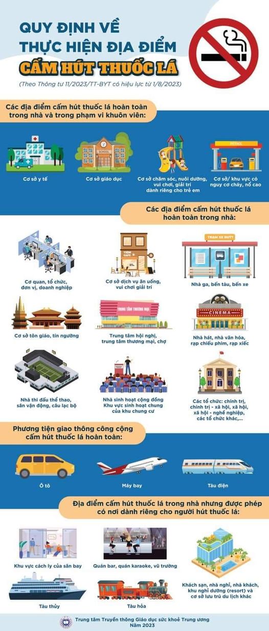 Ngày 11/5/2023, Bộ trưởng Bộ Y tế ban hành Thông tư số 11/2023/TT-BYT (thông tư) quy định về việc thực hiện địa điểm cấm hút thuốc lá và xét tặng giải thưởng môi trường không hút thuốc lá gồm 05 Chương và 28 Điều.
